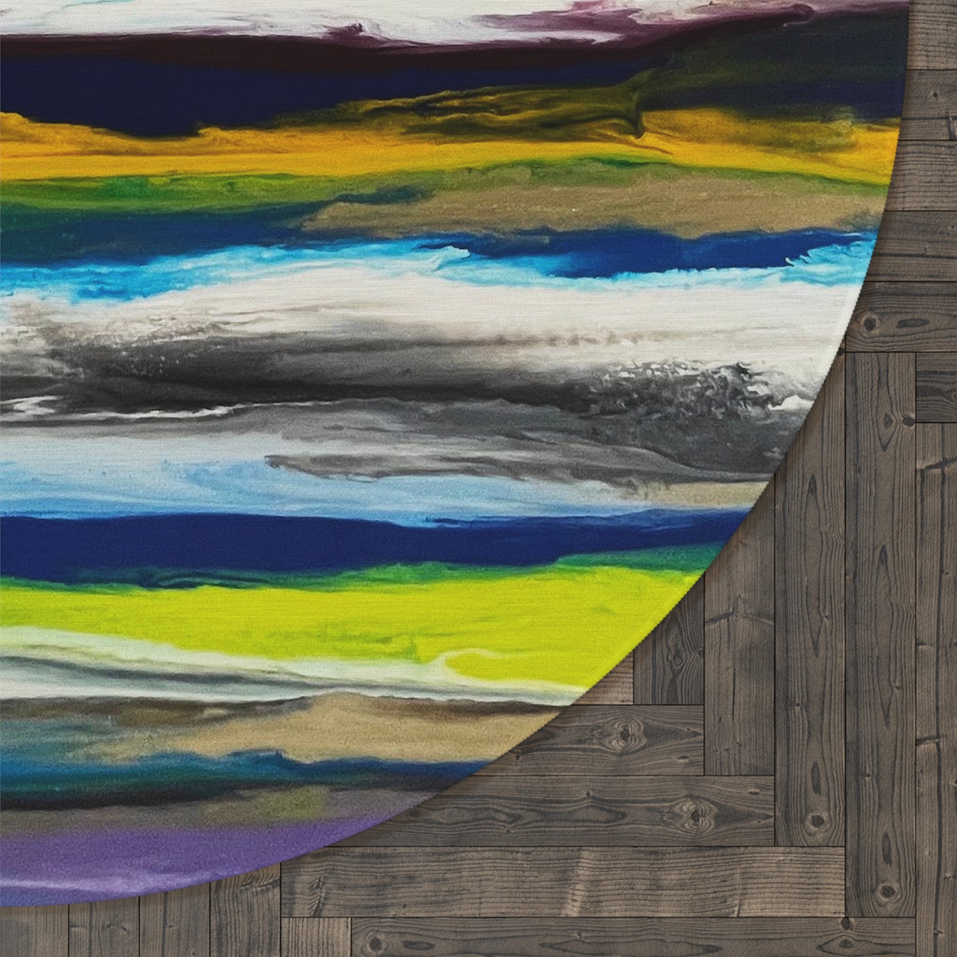 Decorative rugs with fun, bright designs have made a huge comeback. This colorful green and blue stripe design from one of my original paintings is printed onto a round 100% polyester chenille rug in picture-perfect quality. It features a coated backing and hemmed edges for durability. In partnership with TJ designs.